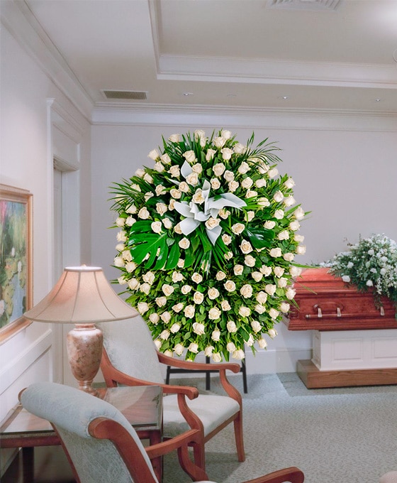 Nuestra Corona Funeraria de 100 Rosas Blancas, de Floristería Tanatorio Mataró, está realizada con 100 rosas de color blanco, decorada con elegantes verdes variados. Hace de ella una corona de flores fúnebres fina y muy elegante. Es una gran corona formada por flores blancas para tanatorio y especial para mostrar nuestro cariño a la familia del difunto.